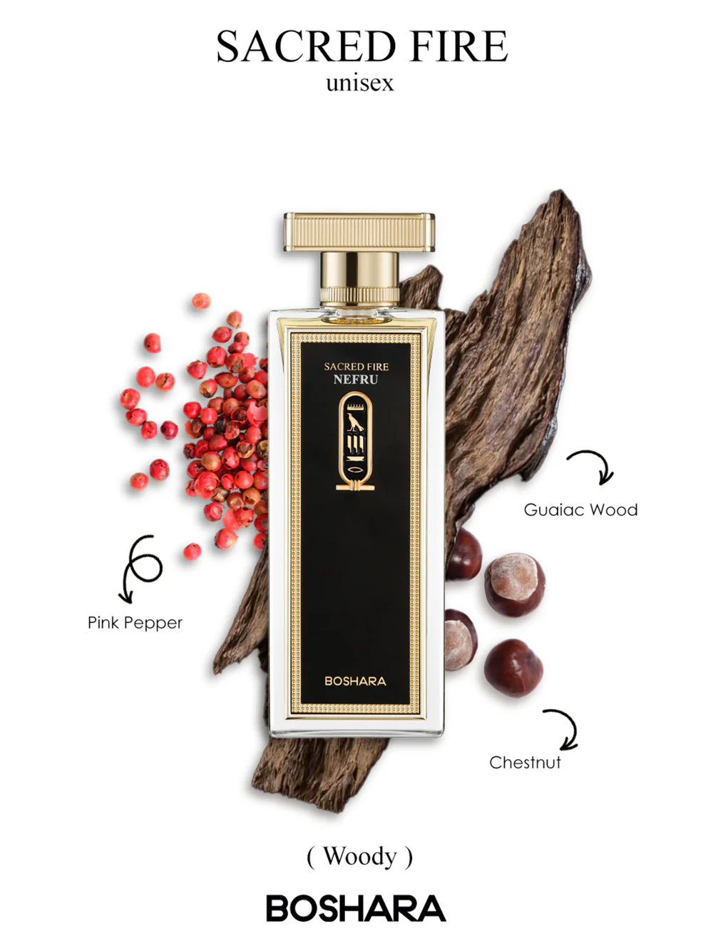 Inšpirovaný rituálmi, mytológiou a architektonickými zázrakmi starovekého Egypta, Posvätný oheň je viac než len vôňa; Je to cesta časom, pozvanie zažiť transcendentnú silu vône